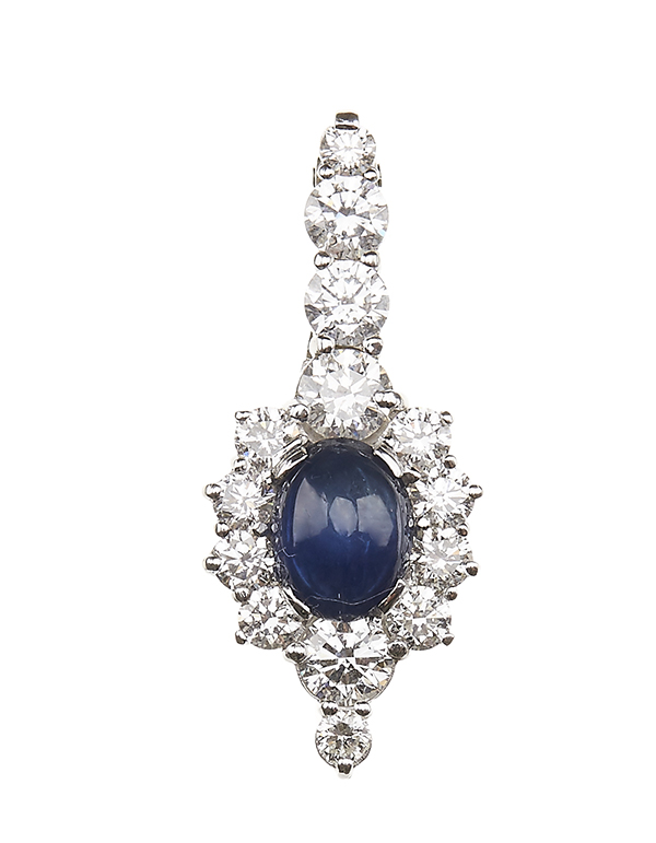 The oval sapphire cut en cabochon, surrounded by round brilliant cut diamonds totalling 2.53cts, mounted in 18ct white gold.