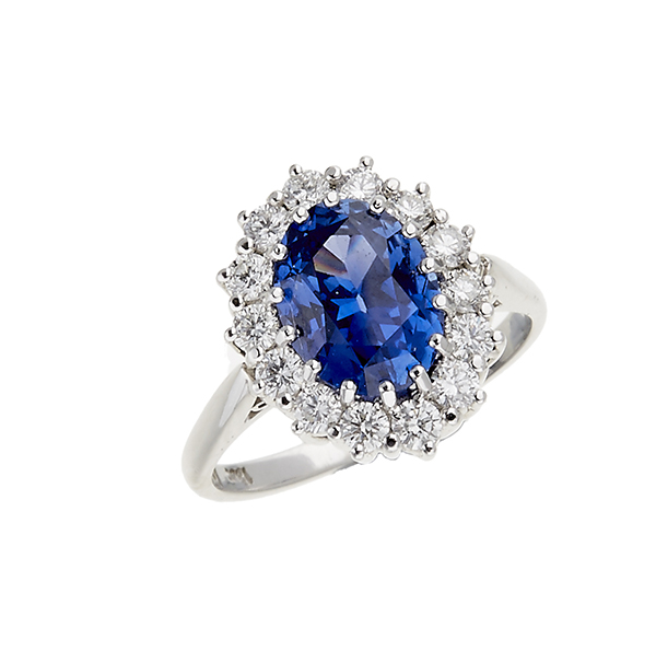 Centrally set with an oval cut sapphire of 3.06cts, surrounded by fourteen round brilliant cut diamonds totalling 0.68cts, mounted in 18ct white gold, ring size N, accompanied by a GSL certificate stating colour blue, no evidence of heat treatment.