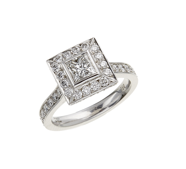 Centrally set with a princess cut diamond of 0.71cts, surrounded by round brilliant cut diamonds, mounted in 18ct white gold, ring size L.