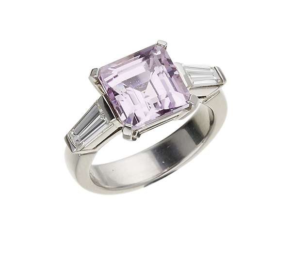 Centrally set with an asscher cut kunzite of 4.48cts, flanked by tapered baguette diamonds totalling 0.94cts, mounted in platinum, ring size M.