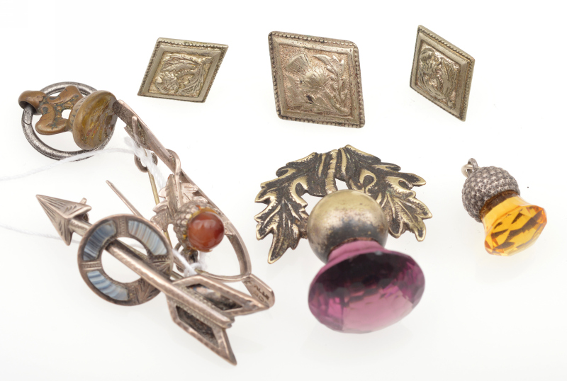 A COLLECTION OF SCOTTISH JEWELLERY, INCLUDING TWO VICTORIAN BROOCHES IN SILVER, A SEAL AND A GUN METAL POCKET WATCH