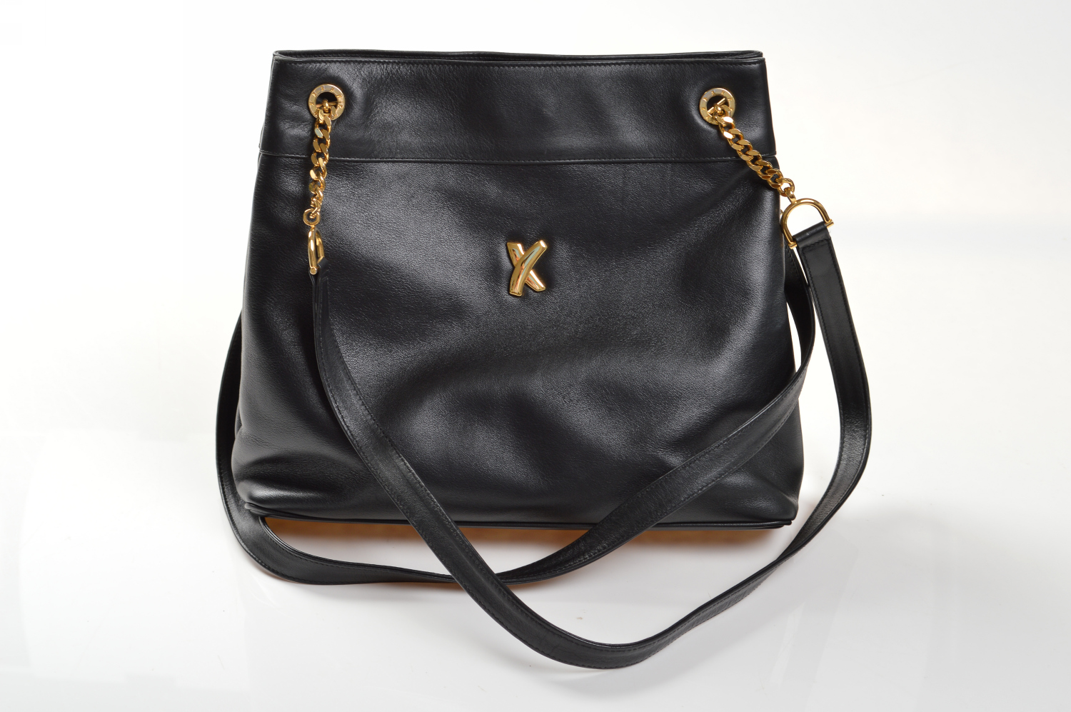 Styled in black leather with gold metal hardware and gold metal chain and leather straps, 28 x 24 x 10cm.