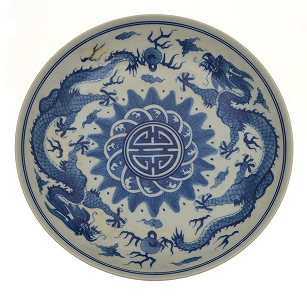 Decorated with two dragons chasing a golden pearl around the central medallion 18.5cm diameter, 3.5cm high.