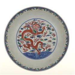 Depicting a five claw dragon in iron red, 20cm diameter, 4.5cm high.