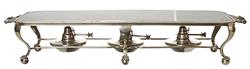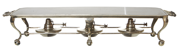 Of typical form with three burners, set upon shell and ball feet, 77cm long.