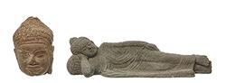 A carved stone Buddha head, 10cm high, together with a reclining Buddha in drapery, 23cm long (2).