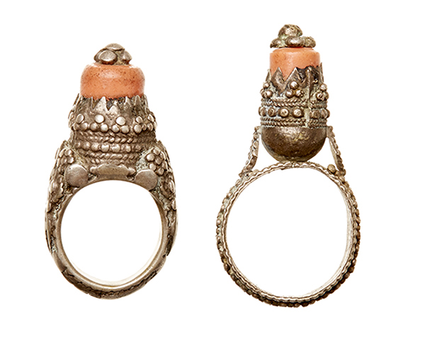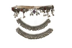 Each decorative anklet set with articulated bell drops to a fabric backing, a similarly stylised necklace with decorative metal drops, highlighted by red paste stones, to a centre plaque with pink paste and turquoise beads. Together with a pair rings set with coral beads above decorative metal work. (5)