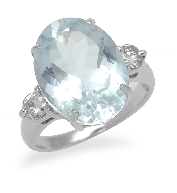 The oval cut aquamarine of 7.35cts flanked by two round brilliant cut diamonds, set in 18ct white gold, ring size M-N.