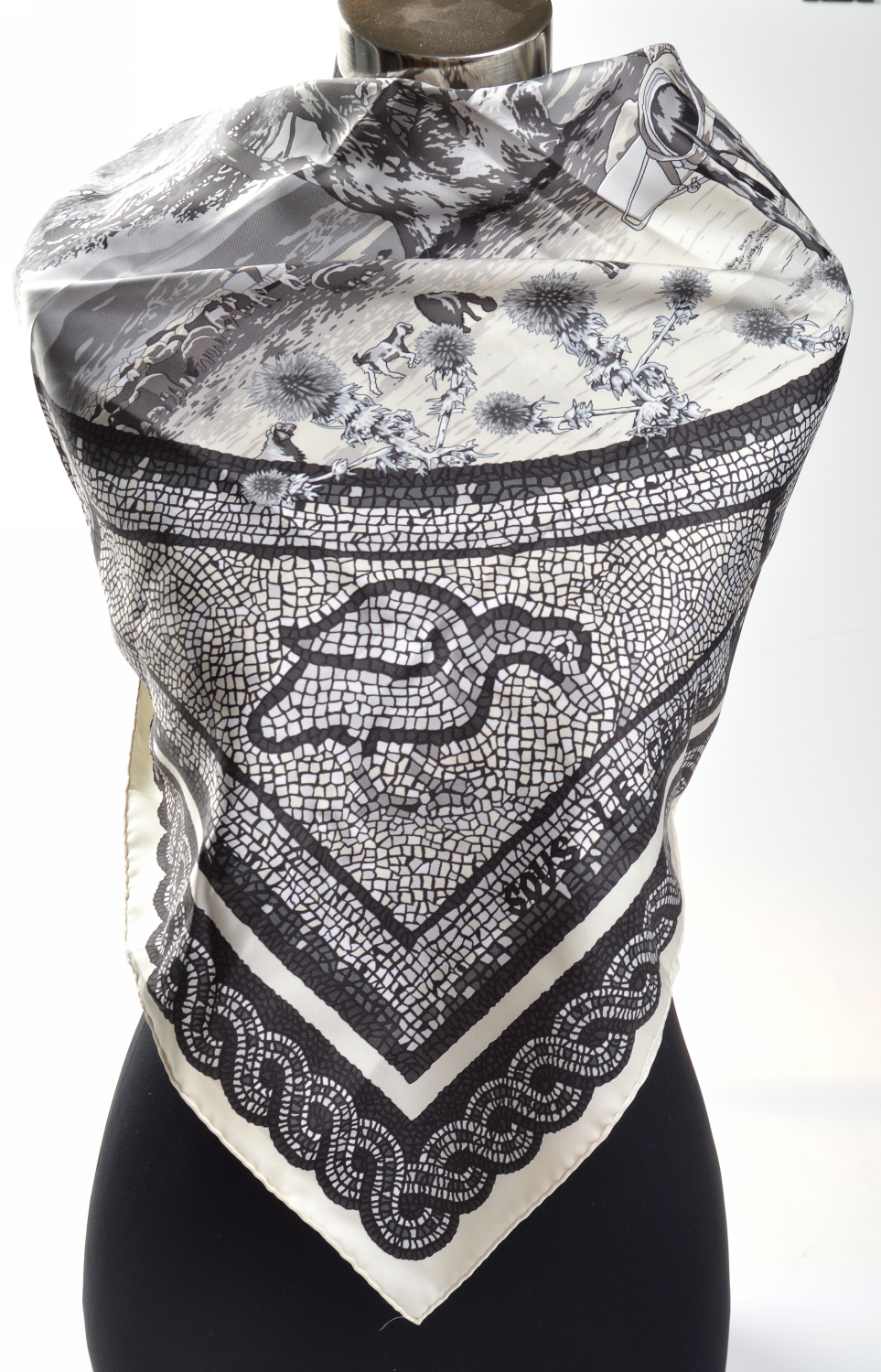 The 'Sous le Cedre' design in tones of black and grey, on an ivory background, 89cm square.