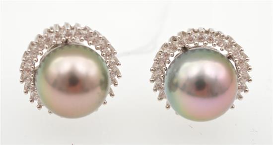 A PAIR OF TAHITIAN PEARL EARRINGS 12.5MM ROUND IN STERLING SILVER WITH ZIRCONIA DETAIL