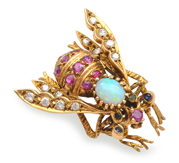 Modelled as an insect, the body set with solid white opal and rubies, the wings set with diamonds and the eyes and antenna set with sapphire and emerald, in 14ct gold.