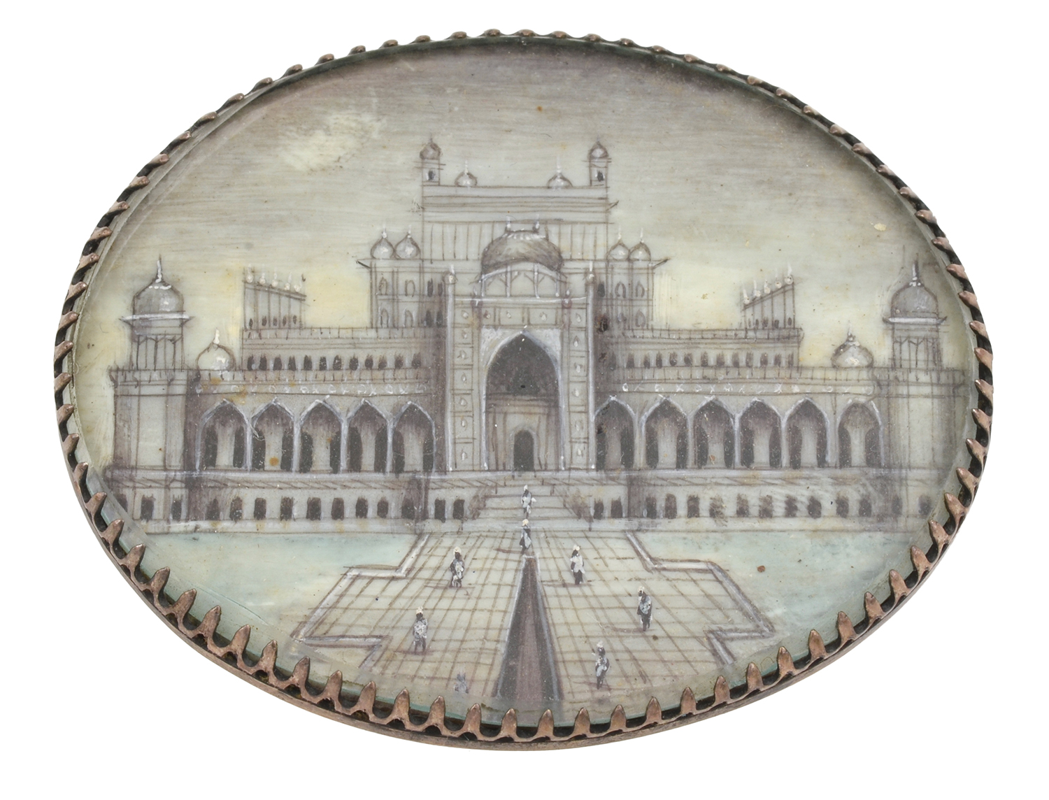The finely painted oval panel depicting the Taj Mahal, hand painted on ivory behind a glazed panel, mounted in silver.