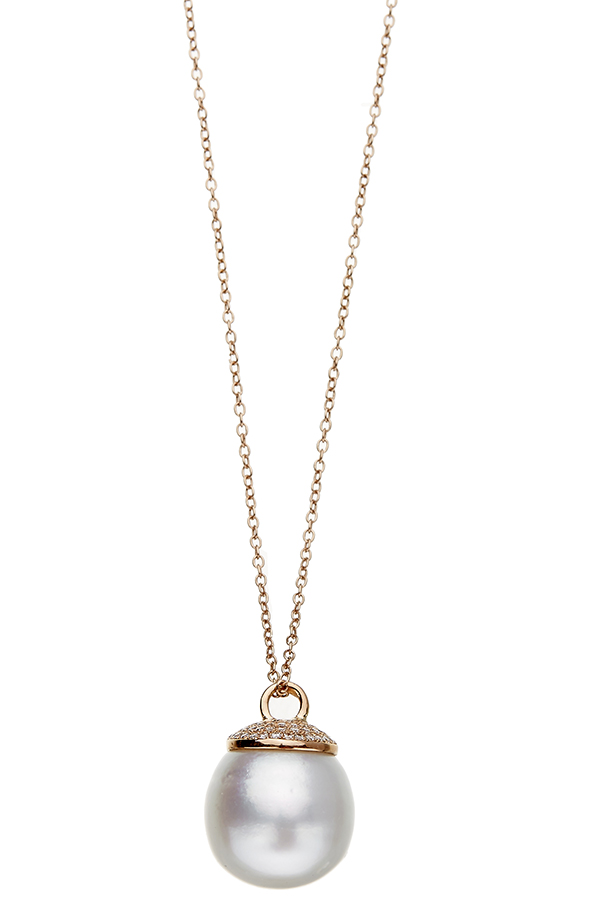 The pearl of pink white hue measuring 18.0mm, below a round brilliant cut diamond set bell cap surmount, mounted in 18ct rose gold, total length 405mm.