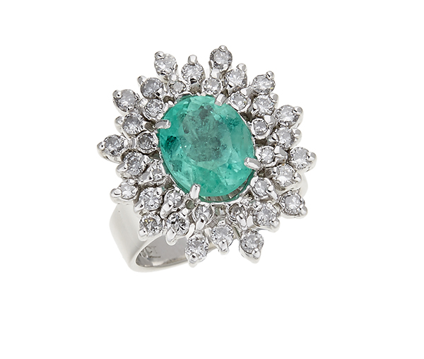 Centrally set with an oval cut emerald of 3.00cts, within a starburst surround of single cut round diamonds totalling 1.10cts, mounted in 18ct white gold, ring size N-O.