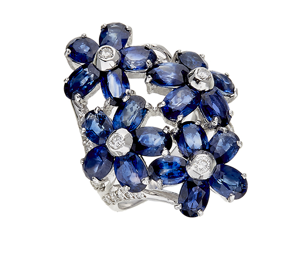 Comprising four floral motifs, each centrally set with a round brilliant cut diamond, surrounded by oval cut sapphires totalling 12.80cts, to diamond set shoulders together totalling 0.35cts, mounted in 18ct white gold, ring size N.