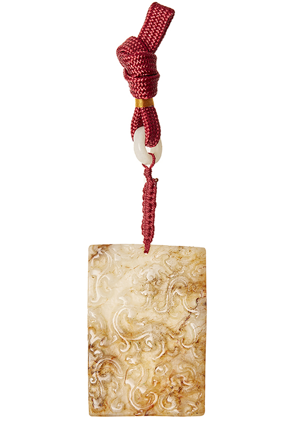 Carved jade scholar in kneeling pose and a jade tablet on string. 7cm high (scholar) (2).