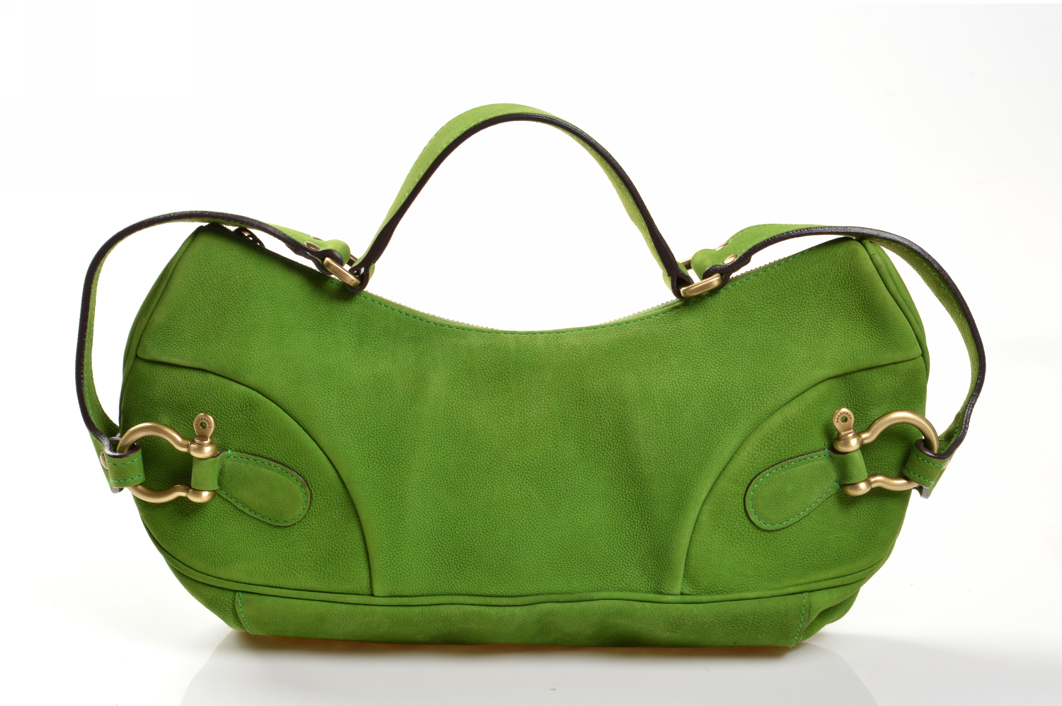 Styled in green leather, with green leather strap and gold metal hardware, 29 x 12 x 8cm.