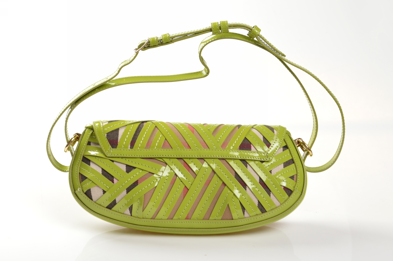 Styled in lime green patent leather and signature Burberry check, lime green leather handle and gold metal hardware, 30 x 14cm.
