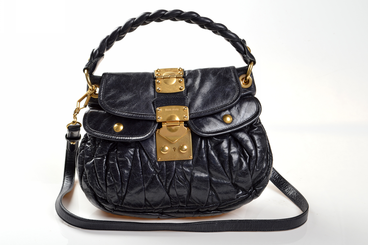 Styled in navy leather, with navy leather handle and strap, and gold metal hardware, together with a keyring by Mui Mui.