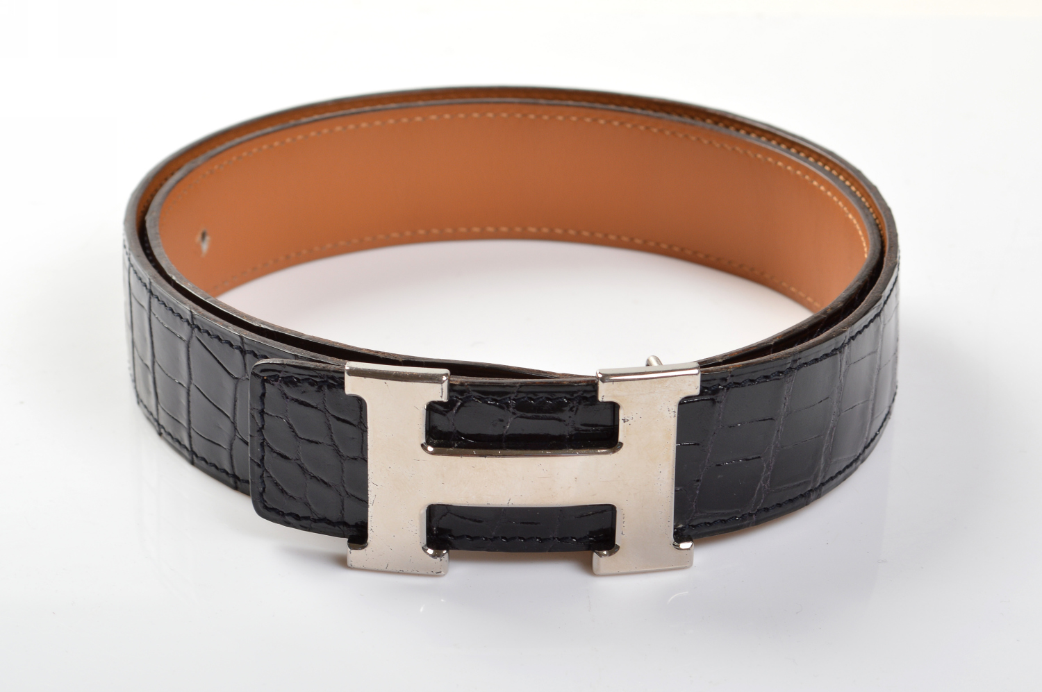 Styled in black crocodile leather, with tan leather underside and silver metal buckle, total length 100cm.
