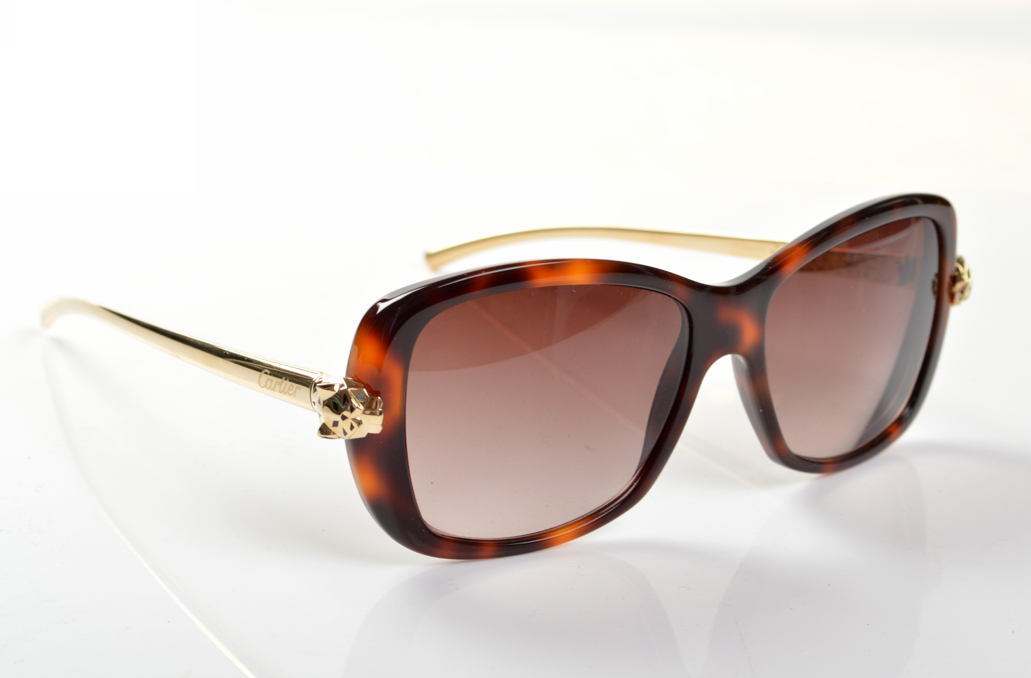 Styled in tortoiseshell composite, with Cartier panther detail to the gold metal arms, with case.