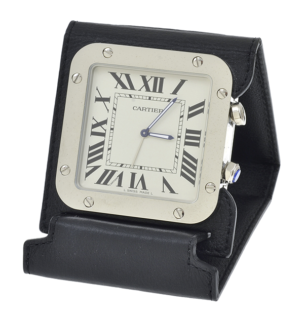 Quartz movement, square white dial with Roman numerals, signed case, dial and movement, stainless steel case with black leather outer case, reference 100240AL-3410, 40mm diameter.