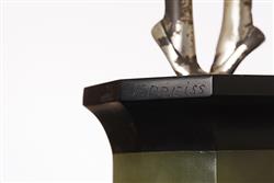 Modelled as two intertwined dancers, in a rare cold painted silver and green colour-way, set upon an onyx base, signed F.Priess, 44.5cm high, with restorations.