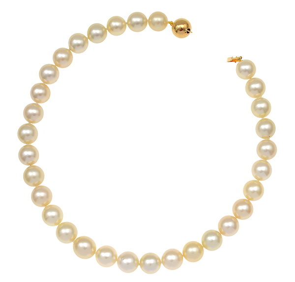 The graduated round pearls of cream and yellow hues measuring 12.00mm - 13.30mm, to an 18ct gold ball clasp, total length 420mm.