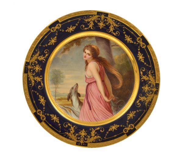 hand painted scene of Lady Emma Hamilton posing as a Bacchante with her hound by her side, titled 'Miss Hamilton', heavily gilded rim with garland design and recessed border, signed Goyer, 24.5cm diameter