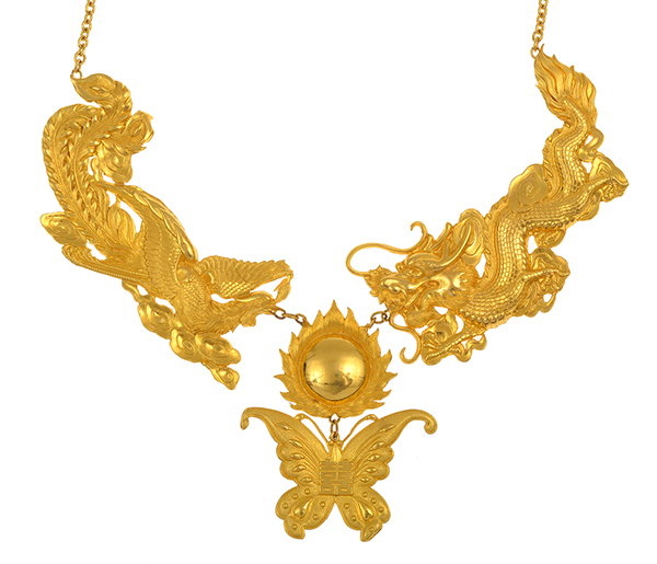 Modelled as a sun with a butterfly suspended below, flanked by a dragon and a phoenix to a curb link chain, set in a high carat gold.
