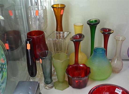 LARGE GROUP OF ART GLASS VASES, INCL. RUBY, SCANDANAVIAN, ETC.