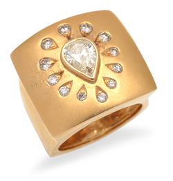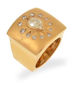 Centrally set with a pear cut diamond of 0.84cts, surrounded by round brilliant cut diamonds, all mounted in a bloom finished panel to a wide band of 18ct gold, ring size N.