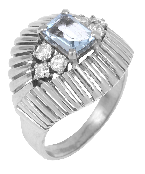 Centrally set with a modified emerald cut aquamarine weighing 0.77cts, with three round brilliant cut diamonds to each shoulder, mounted in in 18ct white gold, ring size P-Q.