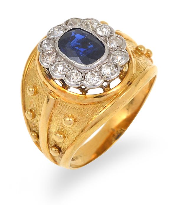 Centrally set with an oval cut sapphire surrounded by round brilliant cut diamonds, mounted in a wide textured band of 18ct gold, ring size O.