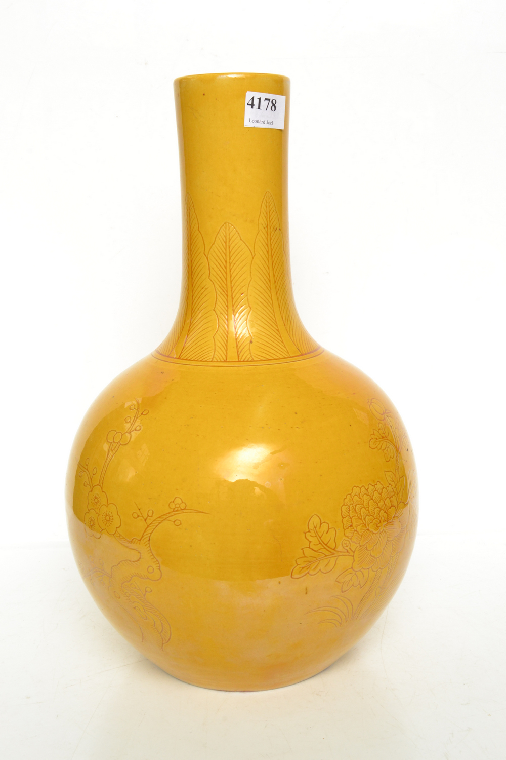 Covered to the body, neck of the interior and base, with a rich yellow iridescent glaze, and decorated with an incised design of potted flowers of the four seasons: plum blossom, peonies, lotus and chrysanthemums. The neck with a band of incised leaves; the base incised with an apocryphal Kangxi six-character mark surrounded by the double-circle.