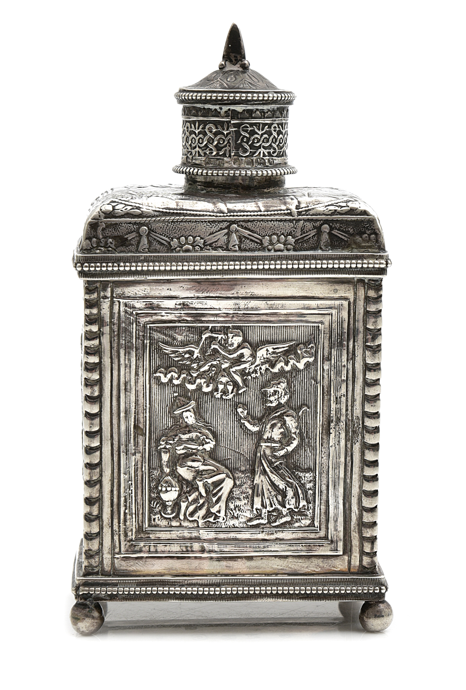 Of square form, each side embossed with a mythological scene within a rectangular border, on four bun feet, approximately 170 gms, 13cm high