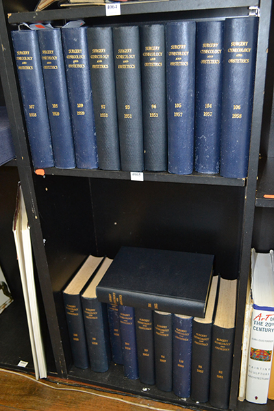 TWO SHELVES OF SURGERY GYNECOLOGY AND OBSTERICS CANVAS BOUND BOOKS FROM THE ESTATE OF SIR WEARY DUNLOP