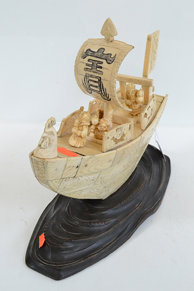 A MEIJI JAPANESE IVORY AND BONE OKIMONO OF A TAKARABUNE SHIP AND FOUR LUCKY GODS