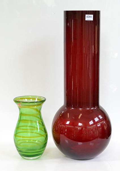 TWO ART GLASS VASES, ONE RUBY AND ONE GREEN