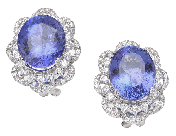 Each featuring an oval cut tanzanite of 14.75cts, surrounded by round brilliant cut diamonds in a pierced oval frame, in 18ct white gold.