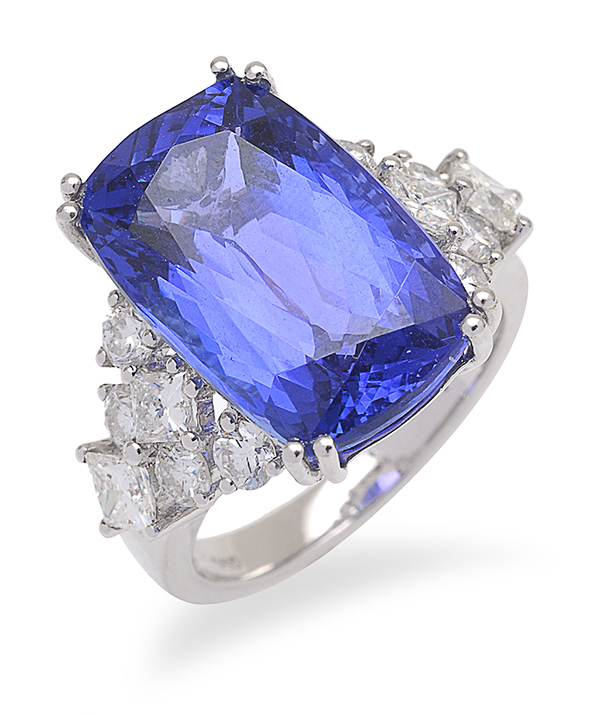 The cushion cut tanzanite of 12.58cts, having round and princess cut diamonds set to the shoulders totalling 1.51cts, mounted in 18ct white gold, ring size L.