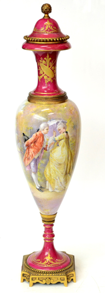 slender pedestal lidded urn with hand painted decoration of a courting couple and a landscape, the lid interior with painted marks Chateau du Longpre, Manufacture Francaise, France, 60cm high