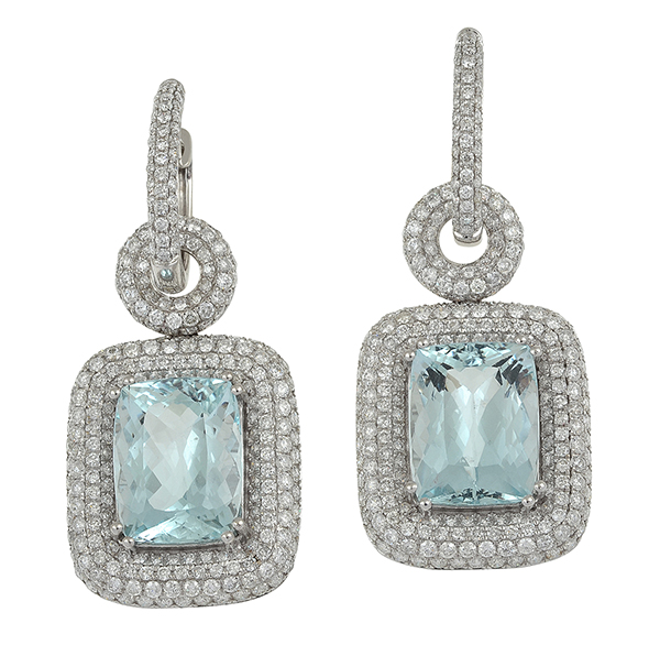 Each set with an emerald cut aquamarine of 7.30cts, surrounded by pave set diamond detail and surmounted by two pave set diamond hoops, mounted in 18ct white gold.