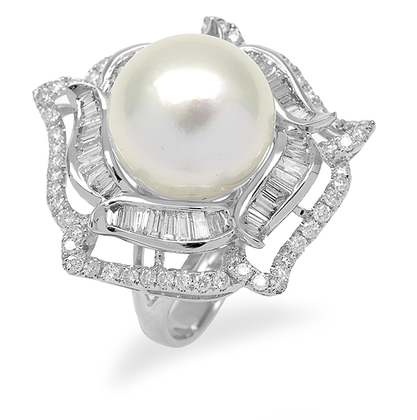 Centrally set with a round pearl of silver hue measuring 13.40mm, set in a floral frame with baguette and round brilliant cut diamonds, mounted in 18ct white gold, ring size L.