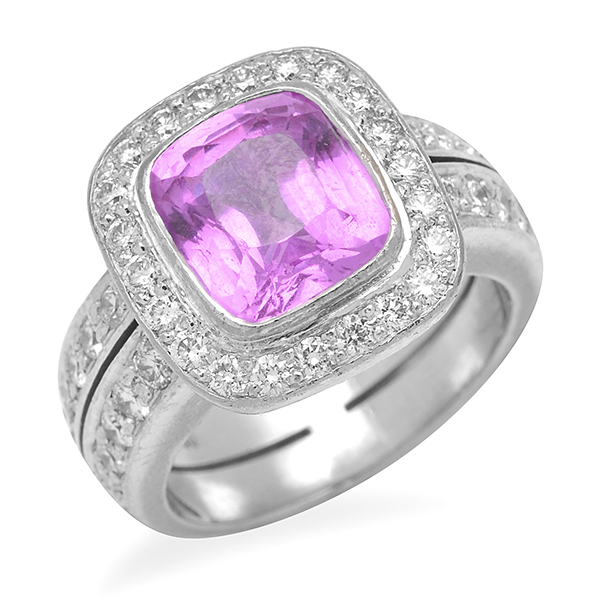 The cushion cut pink sapphire of 4.82cts surrounded by round brilliant cut diamonds with further diamonds set to a double band, mounted in 18ct white gold, ring size M.