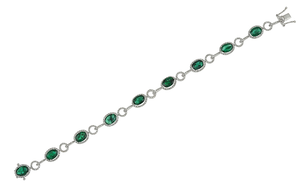 Comprising nine oval cut emeralds, surrounded and interspaced by round brilliant cut diamonds, mounted in 18ct white gold, total length 170mm.