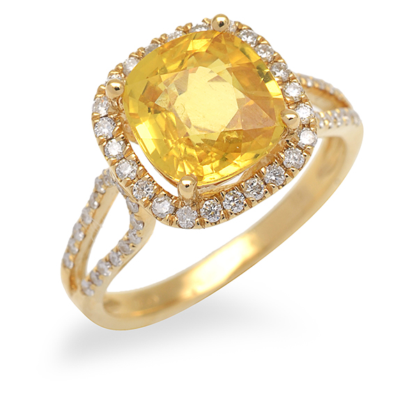 The cushion cut yellow sapphire of 2.80cts, surrounded by round brilliant cut diamonds and further diamond detail to the shoulders, mounted in 18ct gold, ring size L-M.