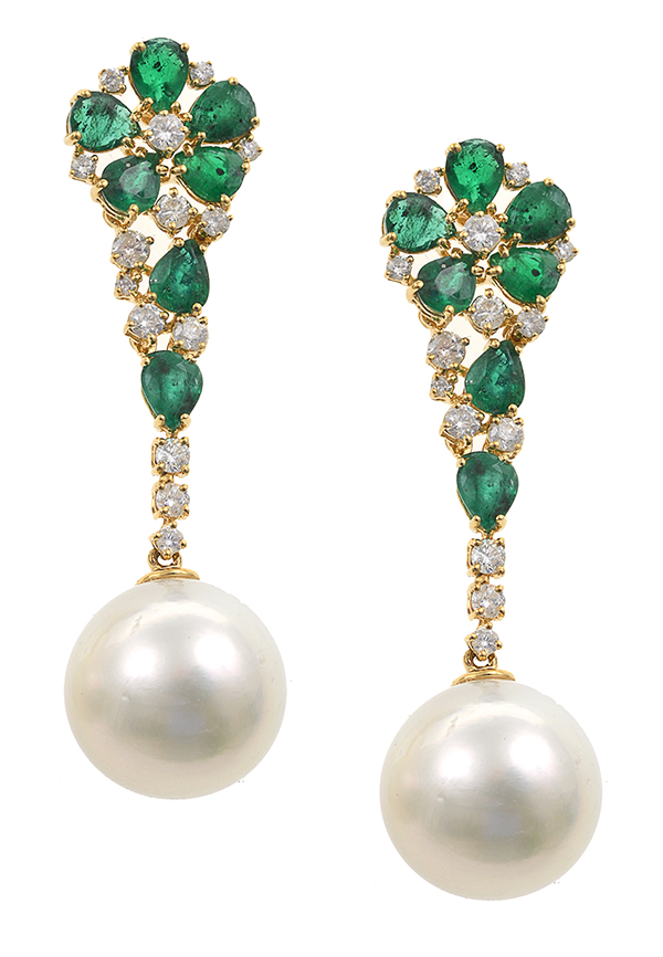 A PAIR OF SOUTH SEA PEARL, EMERALD AND DIAMOND DROP EARRINGS
