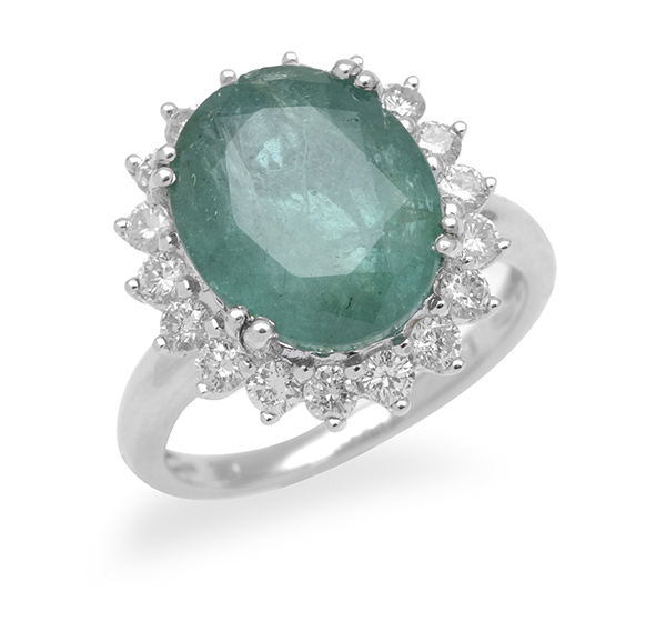 The oval cut emerald of 5.90cts, surrounded by round brilliant cut diamonds totalling 0.74cts, mounted in 18ct white gold, ring size M.