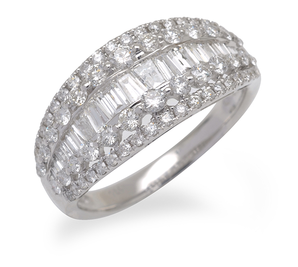 Featuring a central row of baguette cut diamonds, flanked by a double row of round brilliant cut diamonds totalling 1.43cts, mounted in 18ct white gold, ring size N.